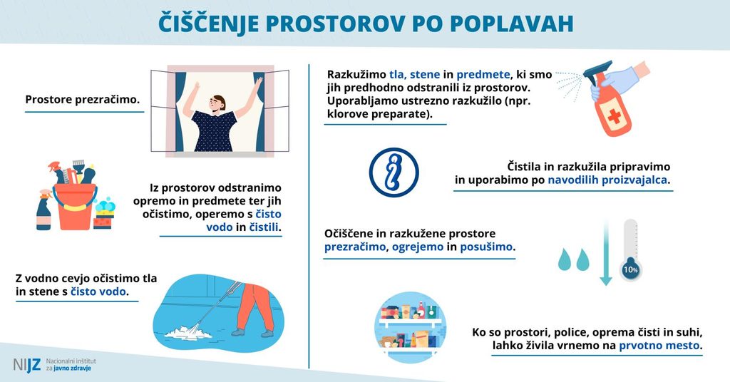 Nacionalni inštitut je na svoji spletni strani objavil informacije o ravnanju z živili, ki so prišla v stik s poplavno vodo, čiščenjem prostorov po poplavah, prekuhavanju vode ...