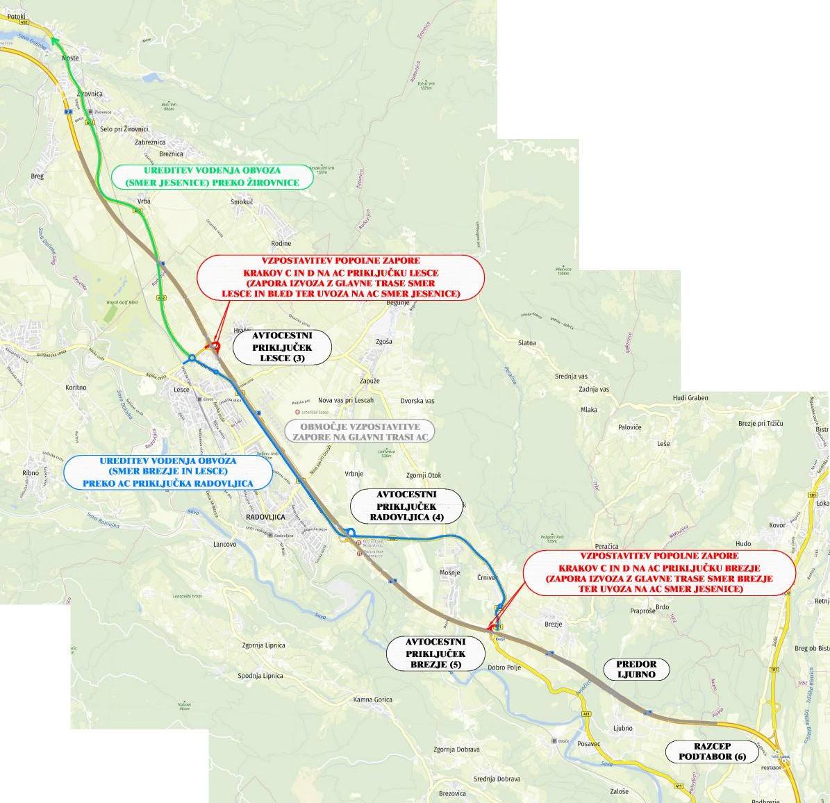 Preusmeritev oziroma vodenje obvoza bo v tem primeru za vse uporabnike cest urejeno preko avtocestnega priključka Radovljica in državnih cest, ki povezujejo vse tri zadevne AC priključke (Brezje, Radovljica in Lesce).