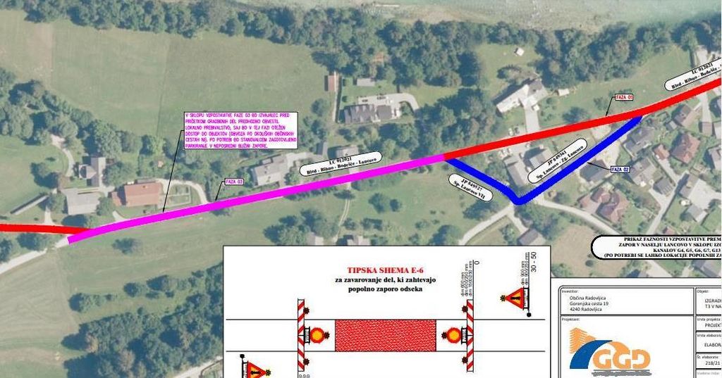 Zaradi izgradnje kanalizacijskega omrežja na Lancovem bo od jutri, 23. marca, do predvidoma 31. maja 2021 izvedena popolna zapora ceste LC 012021 Bled-Ribno-Bodešče-Lancovo na odseku, ki je v situaciji začasne prometne ureditve prikazan kot FAZA 03. Cesta bo vsak dan zaprta od 7. do 17. ure.