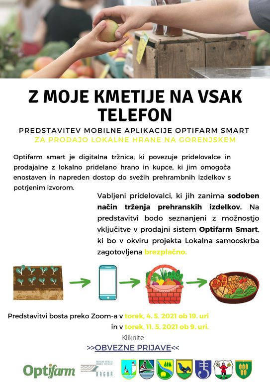 Predstavitvi preko Zooma bosta v torek, 4. 5. 2021, ob 19. uri in v torek, 11. 5. 2021, ob 9. uri. Seznanjeni boste z možnostjo vključitve v prodajni sistem Optifarm Smart, ki bo v okviru projekta Lokalna samooskrba zagotovljena brezplačno