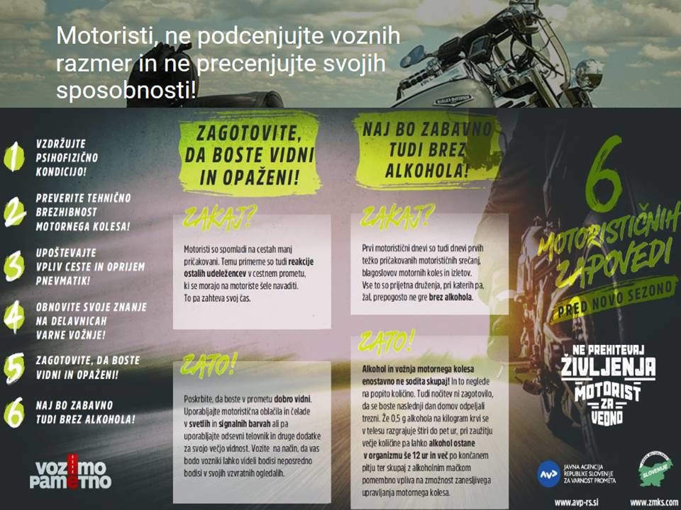 Motoristi se morajo tudi zavedati, da so jim v zimskih mesecih upadle kondicija in vozniške spodobnosti ter da so hočeš nočeš leto dni starejši. Zato njih velja opozoriti, naj ne precenjujejo svojih voznih sposobnosti in ne podcenjujejo voznih razmer, vse ostale udeležence v prometu pa na strpno in preudarno vožnjo ter na dodatno previdnost na cesti.