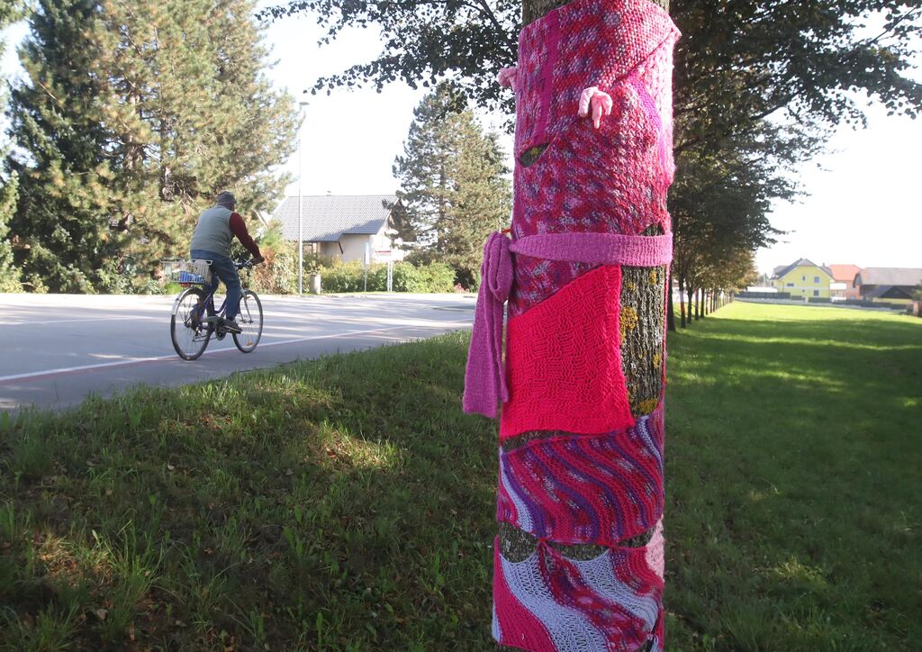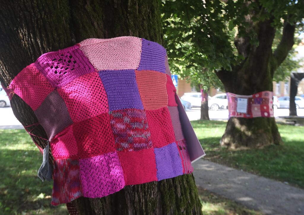 Udeleženke programov, ki jih izvaja Ljudska univerza Radovljica, so tudi letos pletle in kvačkale rožnate pletenine, s katerimi so ovita drevesa v Lescah in Radovljici. Rožnate pletenine predstavljajo moč pa tudi ranljivost, ki jo prinaša bolezen.