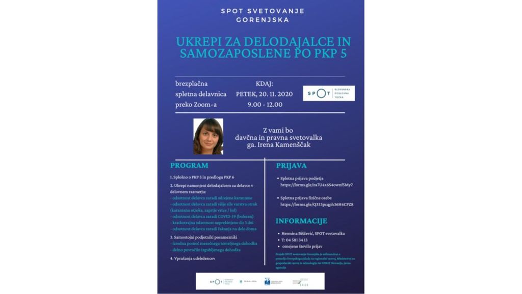 Razvojna agencija Zgornje Gorenjske - SPOT svetovanje Gorenjska vabi na brezplačno spletno podjetniško delavnico »UKREPI ZA DELODAJALCE IN SAMOZAPOSLENE PO PKP 5«.