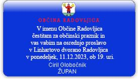 Proslava občinskega praznika o obletnici rojstva Antona Tomaža Linharta bo v ponedeljek, 11. decembra, ob 19. uri v Linhartovi dvorani v Radovljici. Na proslavi se bodo spomnili treh radovljiških velikih mož: Mateja Bora ob 110-letnici njegovega rojstva in dr. Ceneta Avguština ter Ivana Hribovška ob 100-letnici njunega rojstva. V kulturnem programu bodo nastopili plesalka Kaja Lin Jagodič Avguštin, pianist Marko Stajnko in interpreti poezije Januša Avguštin, Suzana Adžić in Žiga Rozman. Program bosta povezovali Katja Stušek in Katja Bevk.