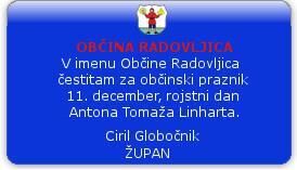 Proslava občinskega praznika ob obletnici rojstva Antona Tomaža Linharta bo v četrtek, 11. decembra, ob 19. uri v Linhartovi dvorani v Radovljici. Pred tem bo Pevsko društvo Anton Tomaž Linhart pripravil tradicionalno Linhartovo podoknico, ki se bo začela ob 18. uri pred spomenikom Josipini Hočevar, nadaljevala pred Linhartovo rojstno hišo in zaključila pri Lipi samostojnosti.