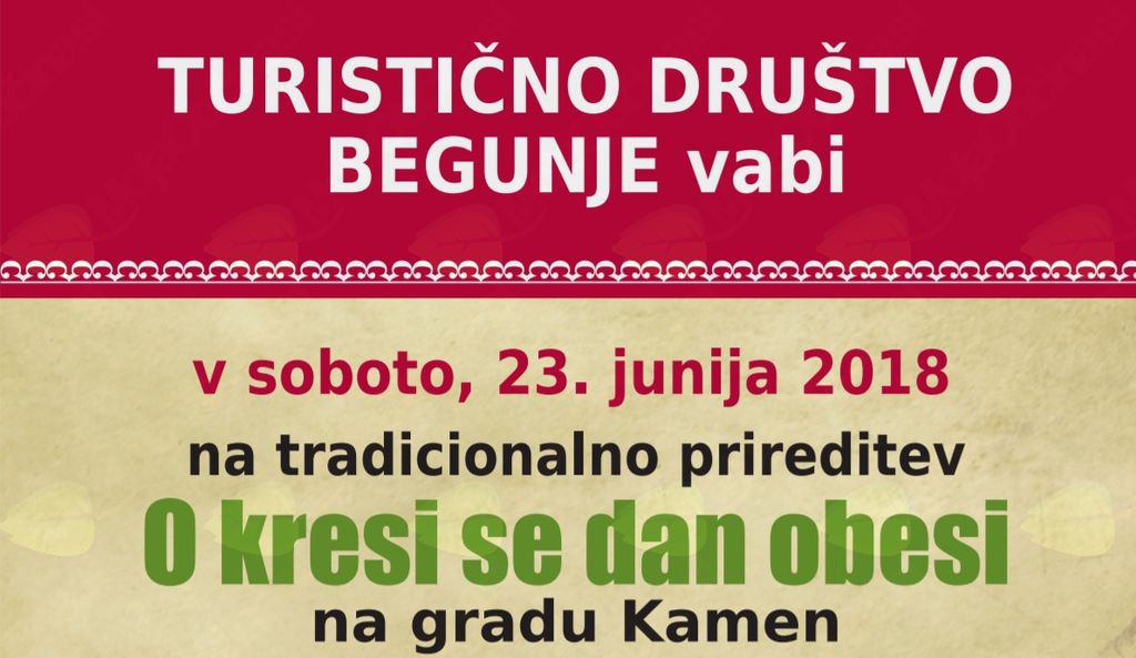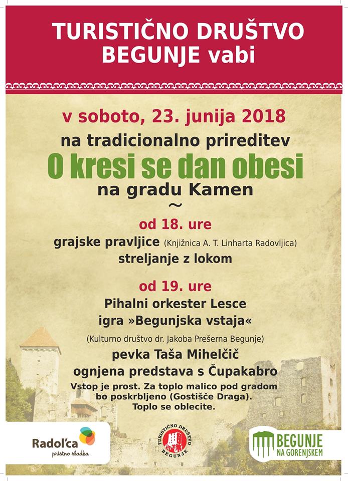 V soboto, 23. junija, se bo ob 18. uri začel program pred gradom Kamnom v Begunjah z grajskimi pravljicami, ki jih pripravlja Knjižnica A. T. Linharta Radovljica, poskusili boste lahko streljati s pravim lokom pod mentorstvom lokostrelca Robert Levsteka. Od 19. ure naprej bodo program oblikovali Pihalni orkester Lesce, domače kulturno društvo z igro Begunjska vstaja, nastopila bo mlada pevka Taša Mihelčič, večer pa se bo zaključil z ognjeno predstavo Čupakabre in prižigom kresa. Za kulinarično podobo kresnega večera bo poskrbelo gostišče Draga. Vstop na prireditev je prost.