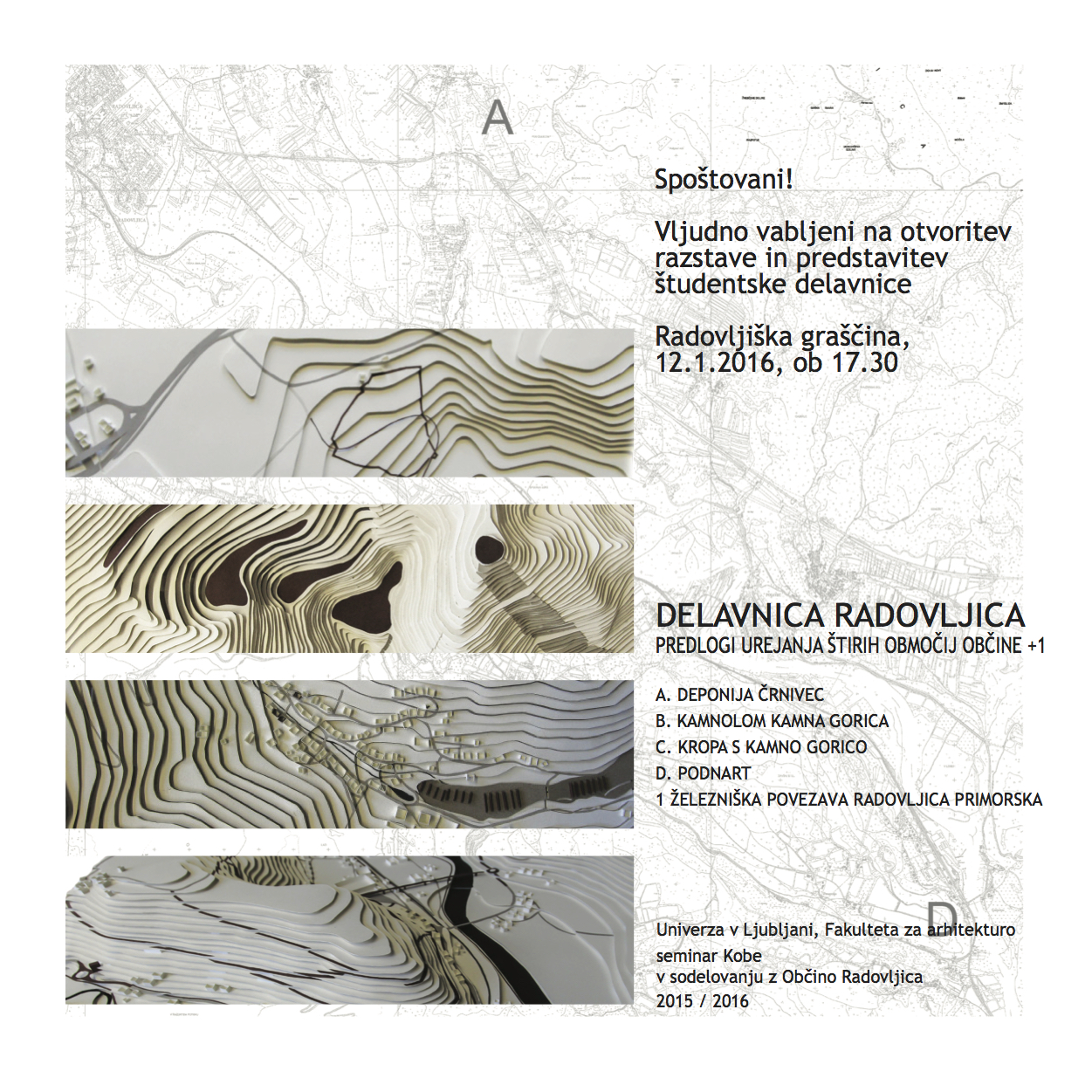 V torek, 12. januarja 2016, ob 17.30 uri bo v prvem nadstropju Radovljiške graščine odprtje razstave izdelkov študentske delavnice s predlogi urejanja območij: deponija Črnivec, kamnolom Kamna Gorica, Kropa s Kamno Gorico, Podnart in železniška povezava Radovljica Primorska.