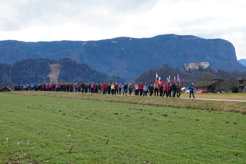 Pohod je tudi letos vodil proti Bledu, kjer je bil prvi postanek namenjen okrepčilu in krajšemu oddihu. Ob 10.30 je pri Prešernovem spomeniku sledila kulturna slovesnost. Zbrane je nagovoril blejski župan Toni Mežan, slavnostni govornik Matej Šurc pa je v svojem razmišljanju opozoril, da se je skozi zgodovino drugačnost pogosto zatirala z nasiljem. Ob zgodbi Črtomirja in Bogomile iz Krsta pri Savici je poudaril pomen razumevanja, dialoga in strpnosti. Nekaj njegovi misli, povzetih iz govora: »…Lepo, da imamo svojo državo, a je problem, da smo vse težave in razprtije prenesli iz stare v novo državo… Saj je prav, da smo patrioti, da ljubimo svojo državo, ampak ne na račun drugega. Včeraj migranti, danes Romi, jutri bomo pa mi na vrsti... Ni res, da ni denarja, denar je, a je napačno razdeljen. Ni prav, da jemljemo revnim in dajemo bogatim. …Fašizem po 80 letih, kar so ga naši dedje porazili, znova dviga glavo po Evropi. In odločno mu moramo reči: Ne, hvala! ..«