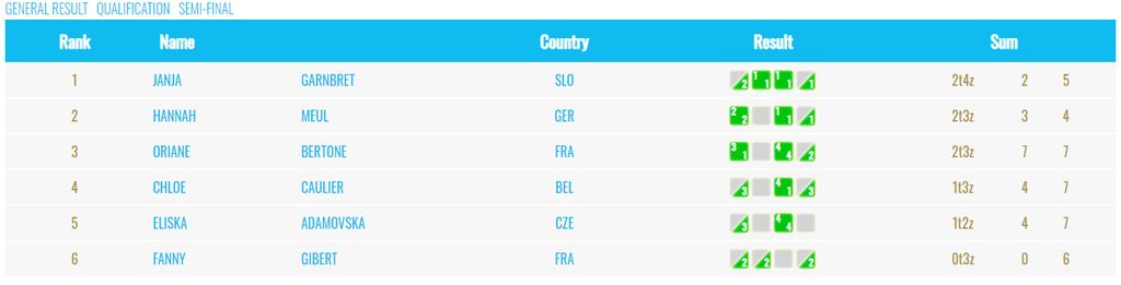 Pri ženskah sta se, poleg Janje Garnbret, v polfinale uvrstili še Vita in Katja Debevec. Vita je končala na 10. mestu, Janja pa je v finalu zanesljivo zmagala.