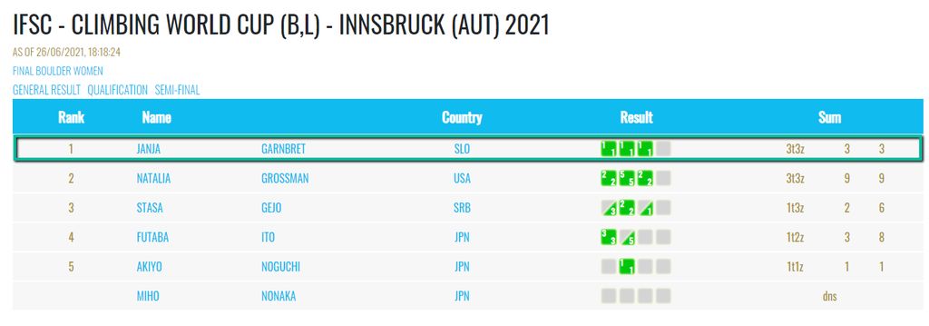 V avstrijskem Innsbrucku se je od 23. do 26. 6. odvijal svetovni pokal, tako v balvanskem kot v težavnostnem plezanju. Radovljičani smo na težavnostnem delu tekmovanja imeli 3 predstavnike, na balvanskem delu pa žal nobenega, saj je Vita Lukan tik pred tekmo staknila lažjo poškodbo kolena in tako preventivno izpustila ta del tekmovanja.