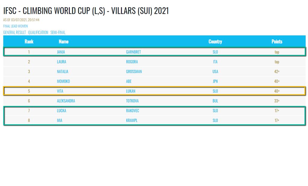 Tekmovalci svetovnega pokala v športnem plezanju so se pretekli vikend mudili v švicarskem Villarsu. Tekmovali so v hitrosti in težavnosti. 12 slovenskih tekmovalk in tekmovalcev so večinoma tekmovali v težavnosti. V hitrosti sta nastopili samo udeleženki olimpijskih iger Mia Krampl in Janja Garnbret, ki je tudi popravili osebni in postavila slovenski rekord (7,916 s).