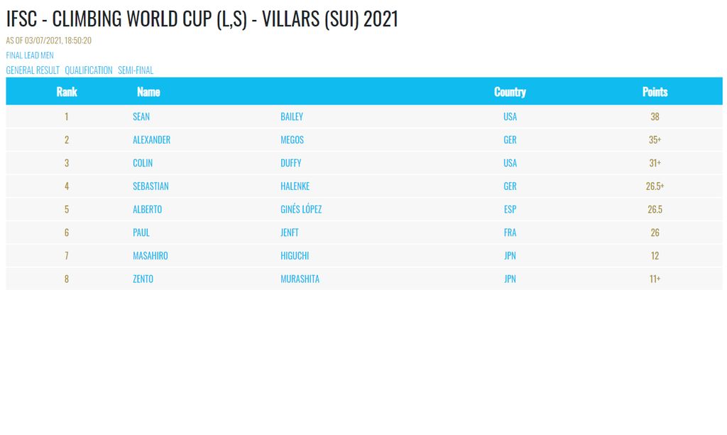 Kvalifikacije v težavnosti so potekale v petek in v polfinale na žalost od naših nista napredovala samo Milan Preskar in Žiga Zajc. Vsi ostali predstavniki so prikazali odlično plezanje in dvignili naša pričakovanja za nastop v finalu in dobre končne uvrstitve. Pri plezanju v polfinalu smo bili priča več napak naših plezalcev. Zaradi tega smo imeli v finalu samo štiri tekmovalke. Domen Škofic je tako končal na 15., Martin Bergant na 24., Luka Potočar pa na 25. mestu.