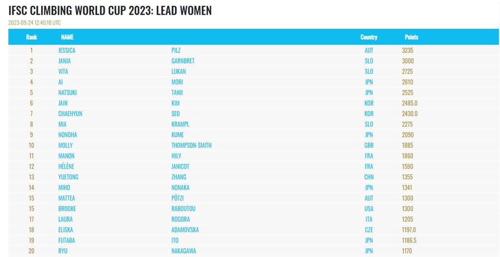 Vita je nastopila na vseh šestih tekmah svetovnega pokala in je na koncu zaostala samo za Janjo Garnbret (SLO) in Jessico Pilz (AUT).