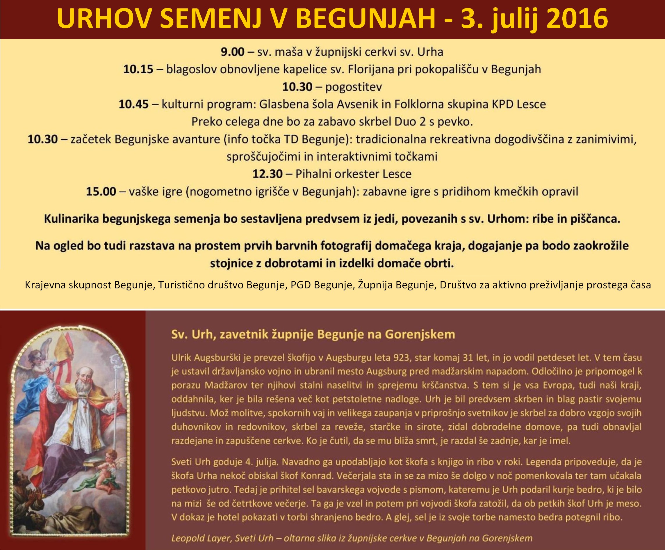 Organizatorji, ki bodo obudili Urhov semenj, si želijo, da postane vsakoletni, tradicionalen dogodek v Begunjah. Veseli bodo vseh, ki se jim boste ta dan pridružili na vsaj katerem izmed dogodkov.