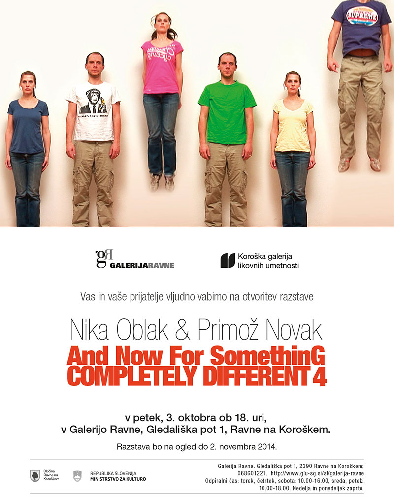 Nika Oblak in Primož Novak na razstavi z naslovom In sedaj za nekaj popolnoma drugega 4 raziskujeta meje med realnostjo in iluzijo, dileme, stare kot je stara umetnost. S povezovanjem videa in kompresorja, računalniške tehnologije in mehanskih prenosov izdelujeta neke vrste robote. Le da ti roboti ne opravljajo dela, ki bi proizvajalo dodano vrednost za lastnika produkcijskih sredstev, temveč le kontrolirano podaljšujejo nesmiselnost nekega početja, ki je predstavljeno na videu.