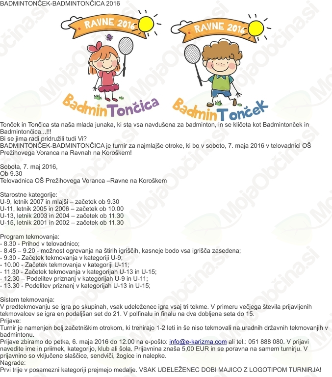 BADMINTONČEK-BADMINTONČICA je turnir za najmlajše otroke, ki bo v soboto, 7. maja 2016 v telovadnici OŠ Prežihovega Voranca na Ravnah na Koroškem!