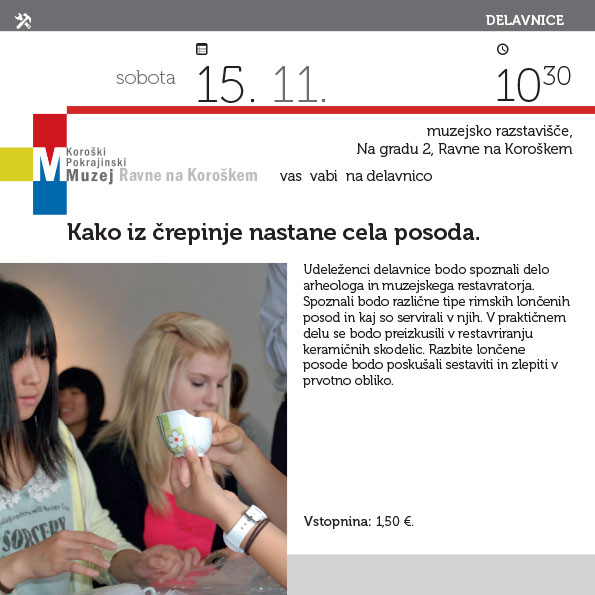 Koroški pokrajinski muzej, Muzej Ravne na Koroškem, vas vabi v soboto, 15. novembra 2014, ob 10.30 na delavnico Kako iz črepinje nastane cela posoda v muzejsko razstavišče Na gradu 2, Ravne na Koroškem.