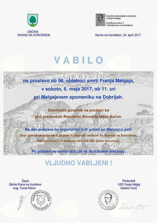 Koroško domoljubno društvo Franjo Malgaj in Občina Ravne na Koroškem vabita na proslavo ob 98. obletnici smrti Franja Malgaja, ki bo v soboto, 6. maja 2017 ob 11. uri, pri Malgajevem spomeniku na Dobrijah.