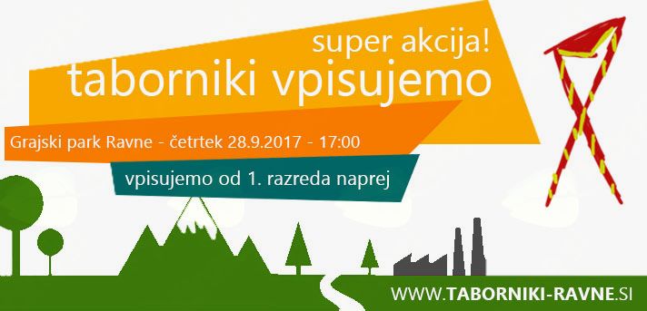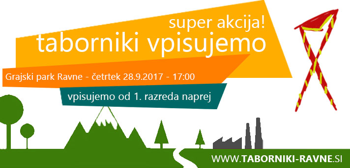Iščeš aktivnosti s katerimi bi svoje proste dneve preživel kar se da zabavno? Obiskuješ osnovno šolo? Bi rad hodil na taborjenja, streljal z lokom in se preizkusil na progi preživetja? Znal postaviti šotor, zakuriti ogenj, spal pod zvezdami in se zabaval s svojimi vrstniki? Te mogoče samo zanima, kaj počnemo pri tabornikih? Potem se nam pridruži v četrtek, 28.9.2017 ob 17:00 v Grajskem parku na Ravnah, kjer bomo za vas pripravili pravo pustolovščino.