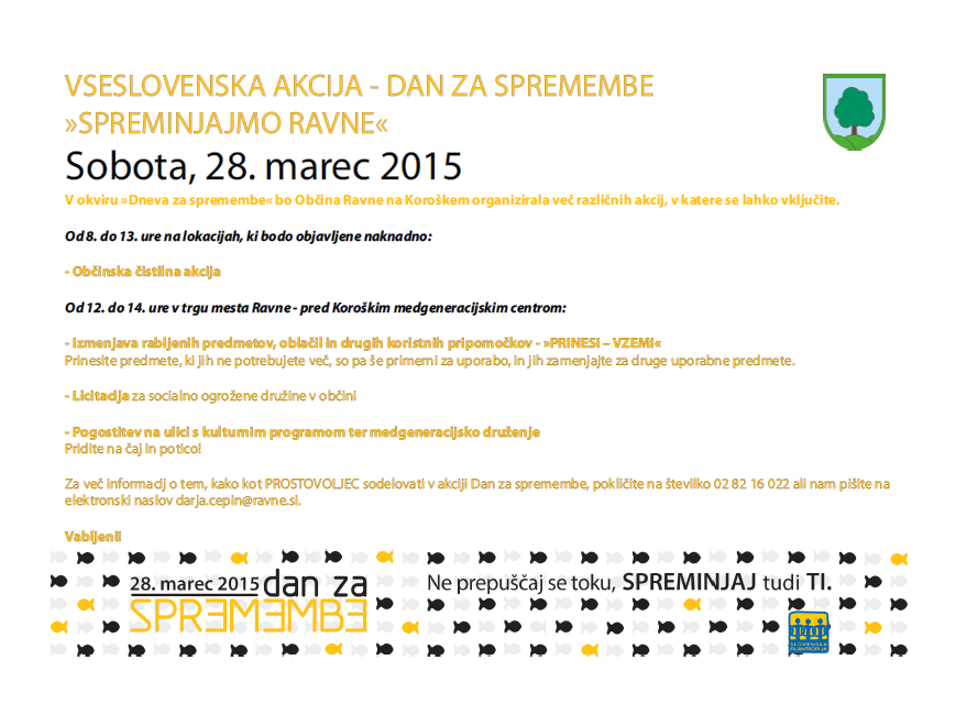 Občina Ravne na Koroškem se bo letos prvič pridružila vseslovenski akciji »Dan za spremembe«, ki ga že šesto leto zapored organizira Slovenska filantropija – Združenje za promocijo prostovoljstva. V letošnjem letu bo ta akcija potekala v soboto, 28. marca 2015. Z Dnevom za spremembe želimo ljudi spomniti na pomembno vrednoto - SOLIDARNOST, ki zaradi hitrega načina življenja vedno bolj izginja iz našega vsakdana. Zato skupaj z vsemi, ki bodo v vseslovenski akciji sodelovali, nagovarjamo tudi občane Občine Ravne na Koroškem, da stopite iz ustaljenih smernic, zavihate rokave in za en dan postanete prostovoljci. Občina Ravne na Koroškem je v letu 2014 prejela naziv »prostovoljstvu prijazno mesto«, zato smo še bolj prepričani, da smo za življenje v naši skupnosti odgovorni vsi in da lahko na tem področju SKUPAJ naredimo še več. V vseslovenski prostovoljski akciji »Dan za spremembe« bomo pokazali, da s prostovoljstvom lahko spreminjamo sebe, druge in naše okolje. V soboto, 28. marca 2015, bomo torej skupaj s prostovoljci širili solidarnost! Upamo, da se nam boste pri cilju povezovanja ljudi v lokalni skupnosti in aktiviranju posameznikov pridružili tudi vi, saj smo lahko le tako, da stopimo skupaj, dovolj močni, da v enem dnevu resnično naredimo vidne spremembe. V okviru »Dneva za spremembe« bo organiziranih več različnih akcij, v katere se lahko vključite: ☼ Občinska čistilna akcija Akcija bo potekala od 8. do 13. ure na lokacijah, ki bodo določene v roku enega tedna pred dnevom za spremembe. Javnost bo o prijavah in zbirališčih pravočasno obveščena. Vsi zainteresirani se lahko že sedaj obrnete na predsednike krajevnih, četrtnih in vaških skupnosti. ☼ Izmenjava rabljenih predmetov, oblačil in drugih koristnih pripomočkov ter licitacija LICITACIJA bo potekala v trgu mesta Ravne (pred Koroškim medgeneracijskim centrom – bivšim Magistratom in začetkom Partizanske ulice), in sicer od 12. do 14. ure. Izkupiček sredstev, pridobljenih z licitacijo, bomo namenili socialno ogroženim družinam. IZMENJAVA MANJŠIH RABLJENIH PREDMETOV, OBLAČIL IN DRUGIH KORISTNIH PRIPOMOČKOV – »PRINESI – VZEMI« bo potekala v trgu mesta Ravne (pred Koroškim medgeneracijskim centrom – bivšim Magistratom in začetkom Partizanske ulice), in sicer od 12. do 14. ure. Občani bodo lahko prinesli predmete, ki jih ne potrebujejo več, so pa še primerni za uporabo, in jih zamenjali za druge uporabne predmete. ☼ Pogostitev na ulici s kulturnim programom Koroškega medgeneracijskega centra Pogostitev na ulici s kulturnim programom bo potekala od 12. do 14. ure v trgu mesta Ravne (pred Koroškim medgeneracijskim centrom – bivšim Magistratom). ☼ Pomoč starejšim občanom pri hišnih opravilih in okolici ter druženje s strani dijakov Program »mladi za starejše«, ki ga občina, šolski center in društvo upokojencev izvajajo že štiri šolska leta in poteka v obliki obiskov dijakov na domu starejših občanov enkrat tedensko, bo prostovoljno izveden tudi na dan 28.3. 2015. Dijaki – prostovoljci bodo na ta dan obiskali starejše, jim pomagali pri hišnih opravilih, urejanju okolice in se z njimi družili.