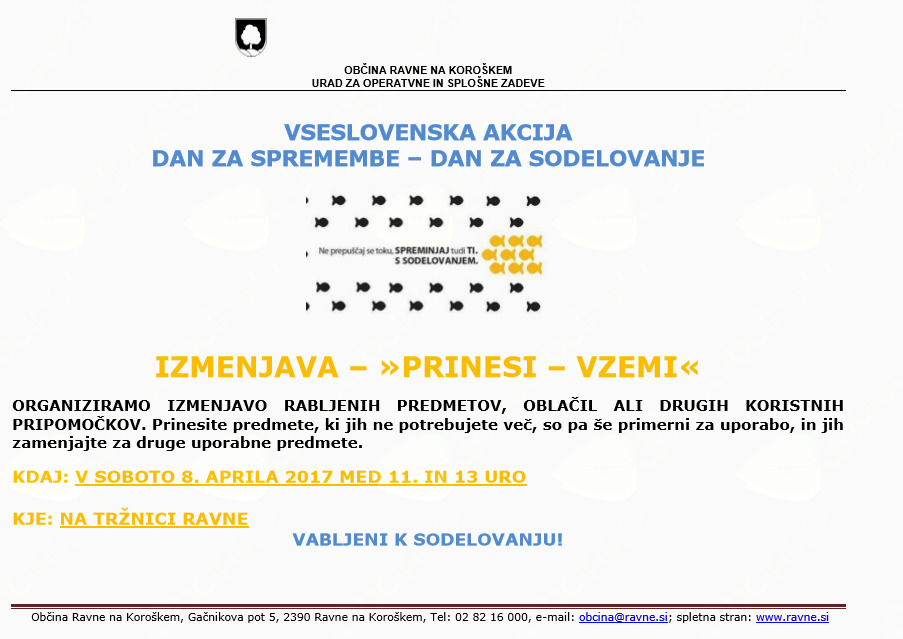 ORGANIZIRAMO IZMENJAVO RABLJENIH PREDMETOV, OBLAČIL ALI DRUGIH KORISTNIH PRIPOMOČKOV. Prinesite predmete, ki jih ne potrebujete več, so pa še primerni za uporabo, in jih zamenjajte za druge uporabne predmete.