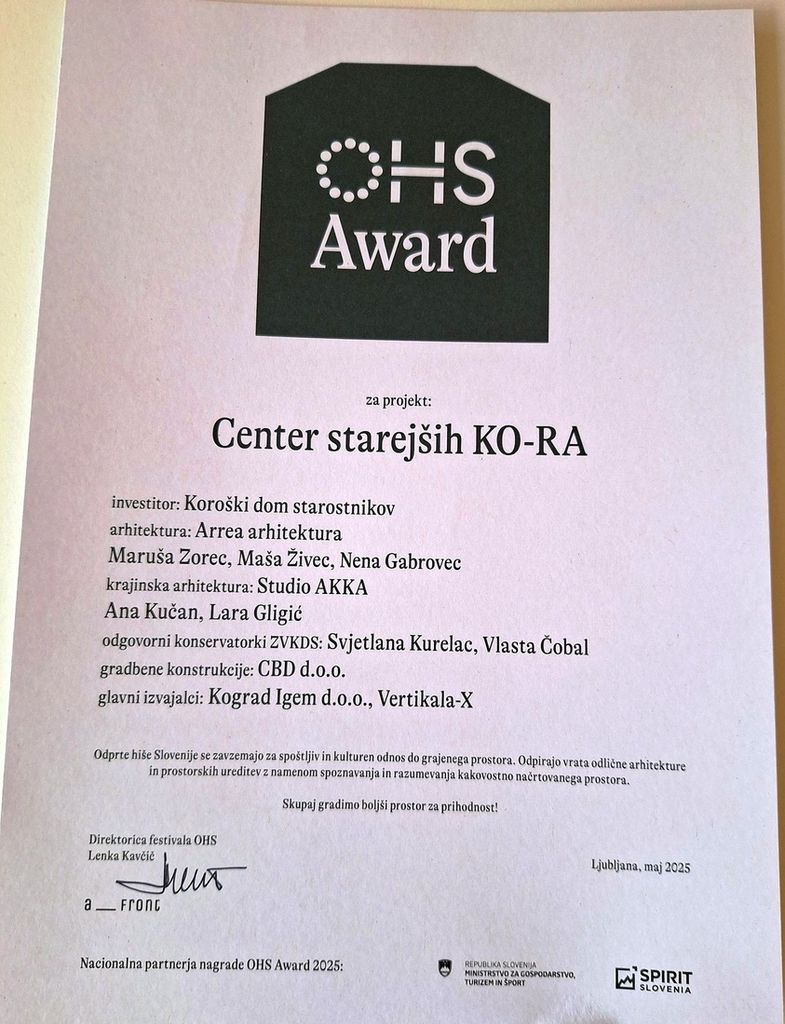 V četrtek, 15. maja 2025, je Center starejših KO-RA s ponosom prejel prestižno nagrado OHS Award, ki jo podeljuje platforma Odprte hiše Slovenije. V kategoriji leseni objekti je center prejel največ vaših glasov – iskrena hvala vsem, ki ste glasovali in nas podprli!