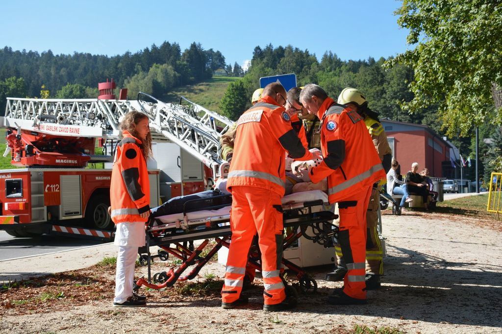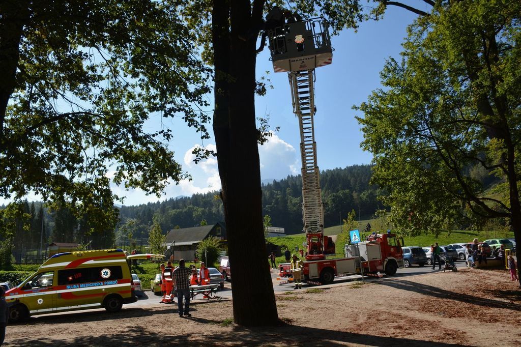 Na srečo so bili prisotni gasilci in reševalci, saj je na drevesu v parku obvisel padalec. Z dobro organiziranima ekipama iz Zdravstveno-reševalnega centra Koroške in Gasilskega zavoda Ravne so ga uspeli rešiti z drevesa in mu nudili prvo pomoč. Policija je seveda kraj dogodka ustrezno zavarovala. Ob koncu se je izkazalo, da je šlo za dobro organizirano vajo vseh intervencijskih služb, otroci pa so bili nad akcijo seveda navdušeni.