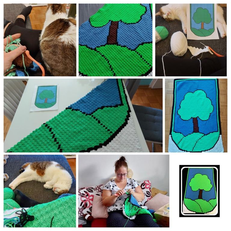 Za izdelavo grba, ki si ga lahko ogledate na sliki, je uporabila 5 barv (belo, zeleno, rjavo, črno in modro) in okoli 2 kg preje.