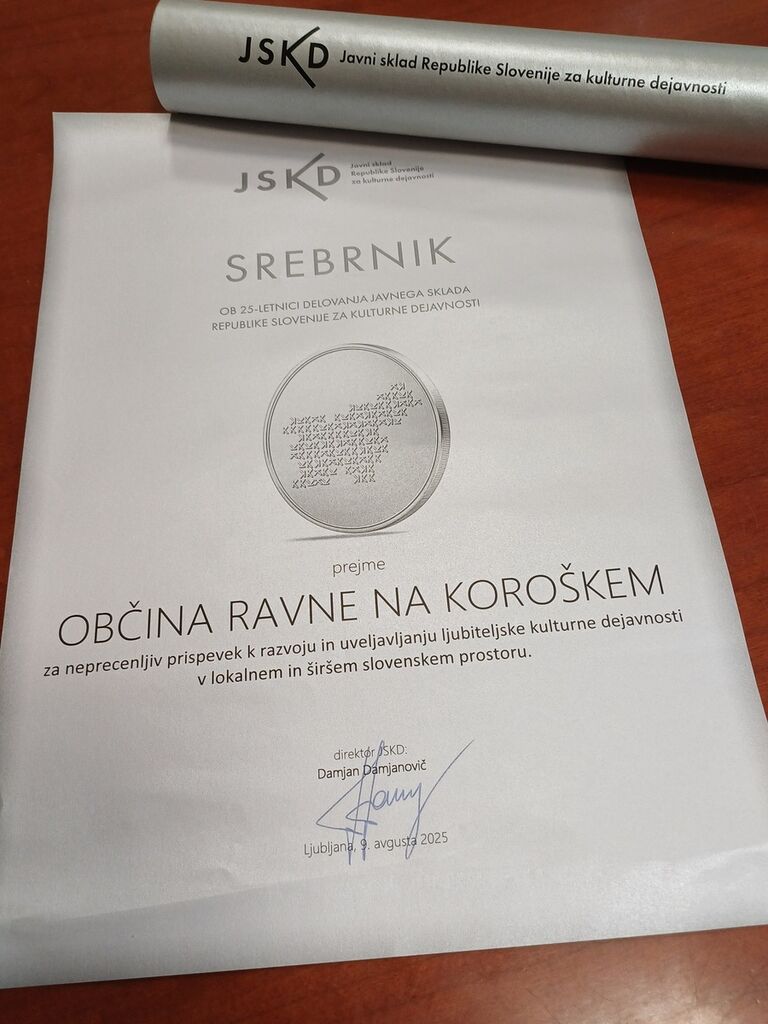 Župan dr. Tomaž Rožen je v imenu Občine Ravne na Koroškem, ob 25-letnici delovanja Javnega sklada Republike Slovenije za kulturne dejavnosti, prejel listino srebrnik kot simbol zahvale za dolgoletno podporo in sodelovanje.