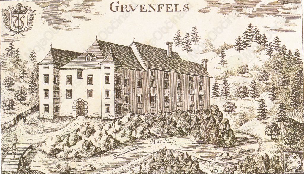 »Čim imaš „votlo peč" za hrbtom, se začne soteska zopet širiti, hkrati pa zagledaš pred njo prelepo lego trga Guštanja. Preden prestopimo most, gremo mimo hlevov Jagrove gostilne, ne vedoč, da je tu še pred dobrimi sto leti stal mogočen grad Grunbichl. Tu so se do poslednjega časa držali še lutrovskipredikanti, dokler jih koroški deželni stanovi niso izgnali ter so se umaknili v Slovenj gradec. O gradu nam ni ostalo nič zapisanega iz tistih časov. Grad sam se je sesul v Mežo.«