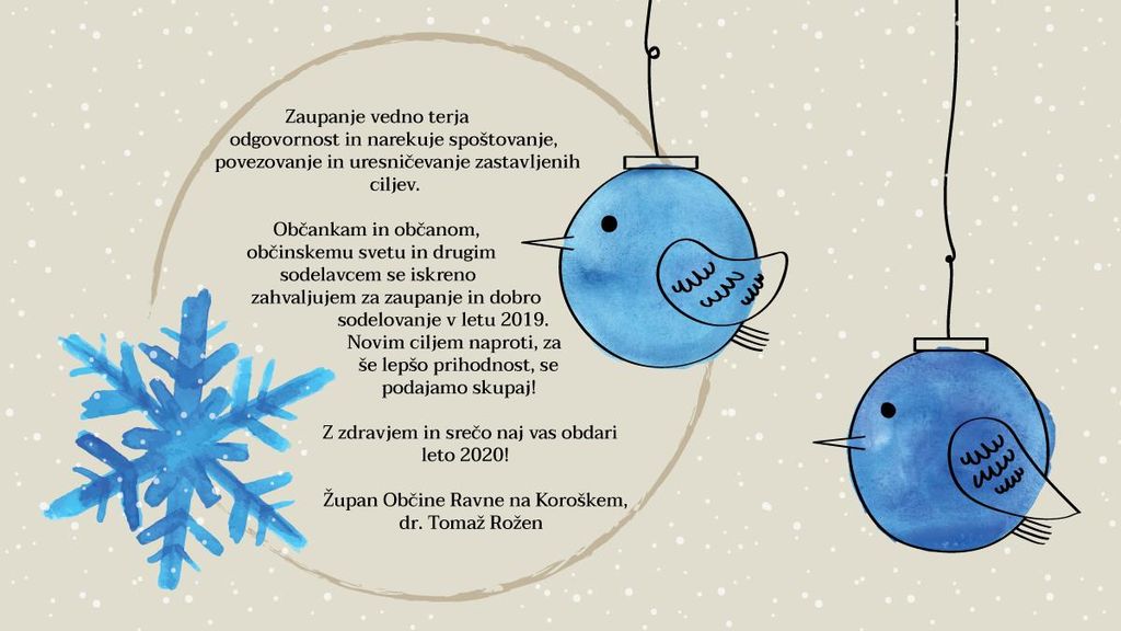 Občankam in občanom, občinskemu svetu in drugim sodelavcem se iskreno zahvaljujem za zaupanje in dobro sodelovanje v letu 2019. Novim ciljem naproti, za še lepšo prihodnost, se podajamo skupaj!