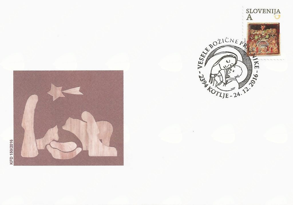 Letošnja Božična izdaja zajema priložnostni poštni žig, ki bo v uporabi na pogodbeni pošti 2394 Kotlje v soboto 24.12.2016 in dotisk na kuverti (motiv – sveta družina) z oznako KFD 150/2016.