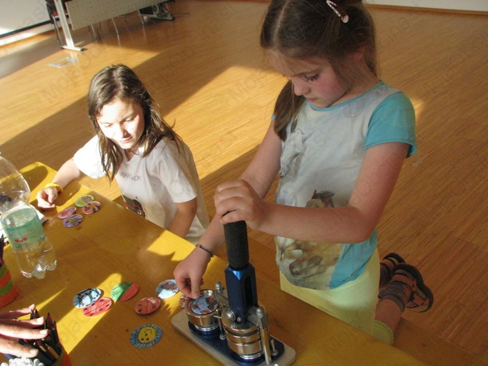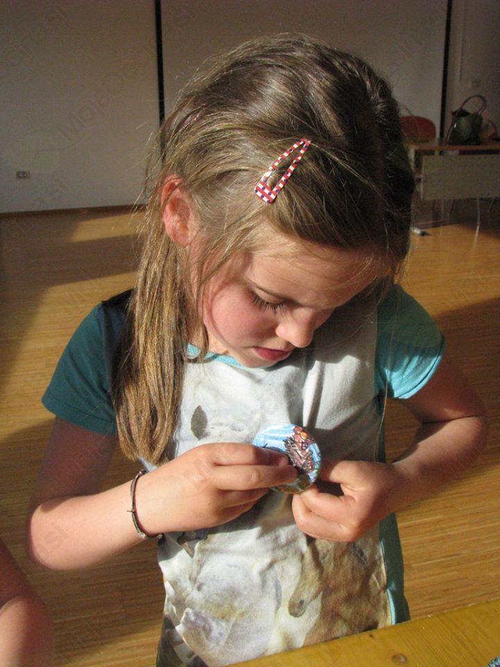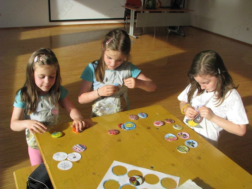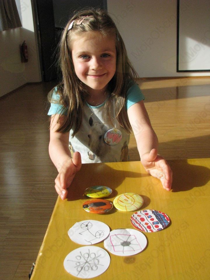 Tokrat so si otroci ogledali razstavo stalne galerijske zbirke avtorjev Kaje Brezočnik in Viktorja Senkova URE. Kasneje so si izbrali motiv in ga narisali oziramo prenesli v značko.