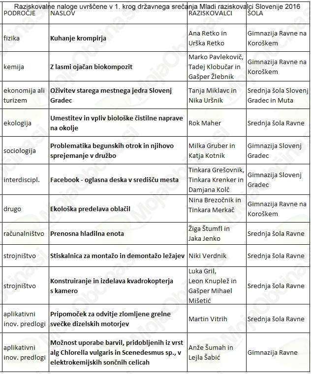 6. in 7. aprila 2016, so bile na Gimnaziji Ravne predstavitve srednješolskih raziskovalnih nalog, v okviru projekta Mladi raziskovalci Koroške (MRK). Predstavljenih je bilo dvajset raziskovalnih nalog z različnih področij. Svoje raziskovalne naloge so zelo uspešno predstavili tudi dijaki Srednje šole Ravne, saj so se prav vsi uvrstili v nadaljnji krog tekmovanja:
