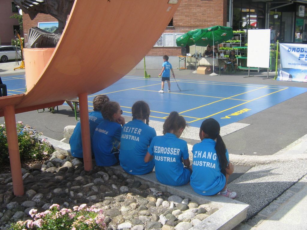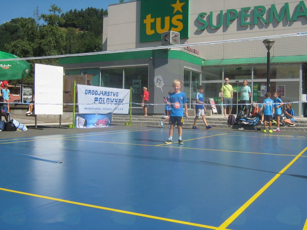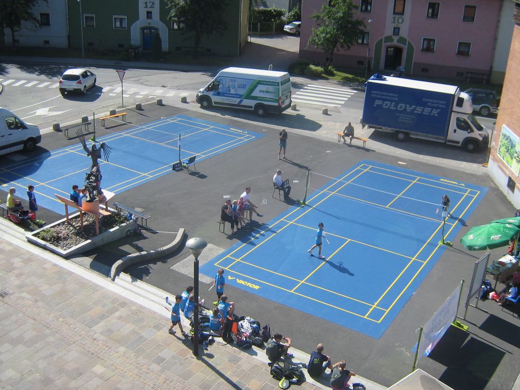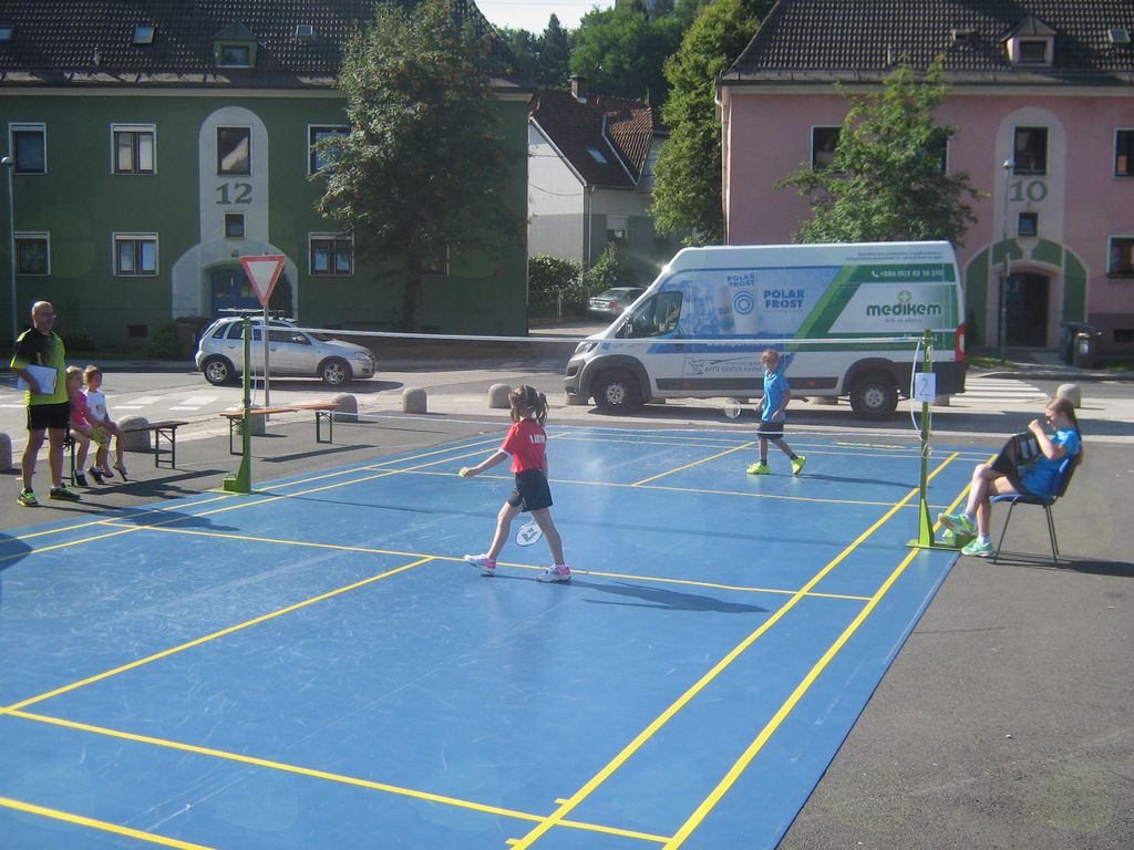 Prireditveni prostor v središču mesta pred Tušem na Ravnah na Koroškem so tokrat zasedli mladi badmintonisti in badmintonistke. Številni mimoidoči in naključni obiskovalci, ki so navajeni nekoliko drugačnih prireditev in dogodkov na tem prostoru, so se tako vsaj za trenutek zaustavili in se najprej spraševali kakšen shod je zdaj to…!? Veliko zanimanja je bilo s strani voznikov, ki so vidno upočasnjevali vožnjo po cesti mimo prostora in z zanimanjem pogledovali proti samemu prizorišču dogajanja. Nič strašnega se ni zgodilo, le turnir v badmintonu je tokrat potekal na prostem, s promocijskim namenom, da ga približamo čim širšemu krogu ljudi. Badminton je dvoranski šport in tokrat smo turnir priredili na prostem primerno letnemu času…Igralci in igralke so se različno prilagajali tem zunanjim nepredvidljivim razmeram, kar je dalo le še dodaten draž samemu turnirju.