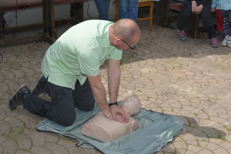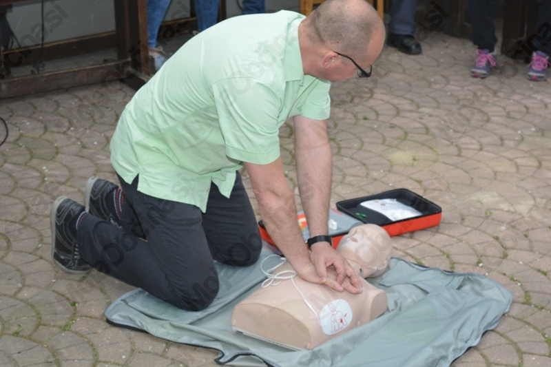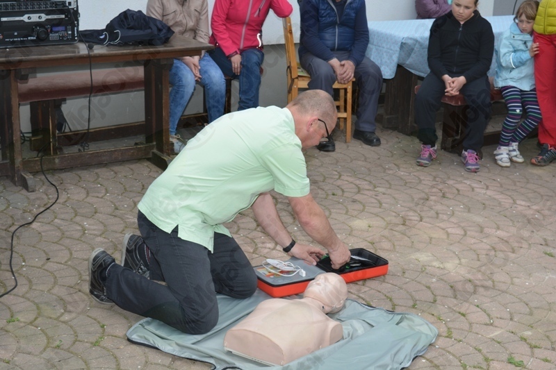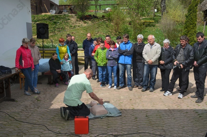 Kako se uporablja defibrilator ter kako nudimo prvo pomoč je pojasnil in predstavil Peter Kordež, predstavnik Koronarnega kluba Mežiške doline in uslužbenec reševalne postaje Zdravstvenega doma Ravne na Koroškem. Za popestritev pa je z igranjem na harmoniko poskrbel mlad glasbenik Žiga.