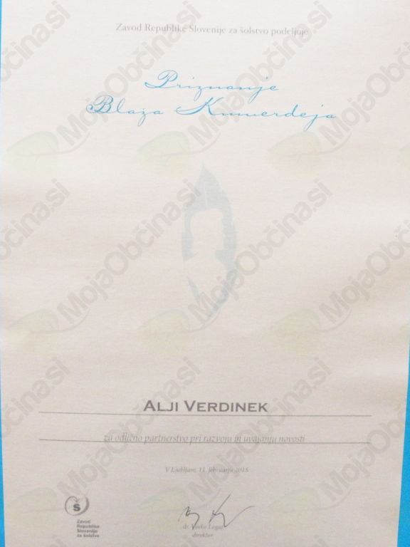 Na predlog komisije za podelitev priznanj je Zavod RS za šolstvo letos podelil pet priznanj Blaža Kumerdeja. Priznanja za uspešno sodelovanje z Zavodom RS za šolstvo pri pedagoškem, inovacijskem in organizacijskem delu je med drugimi prejela: