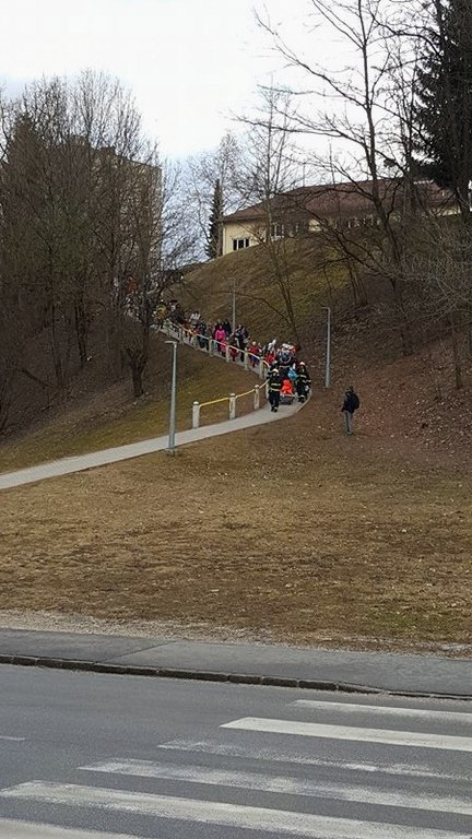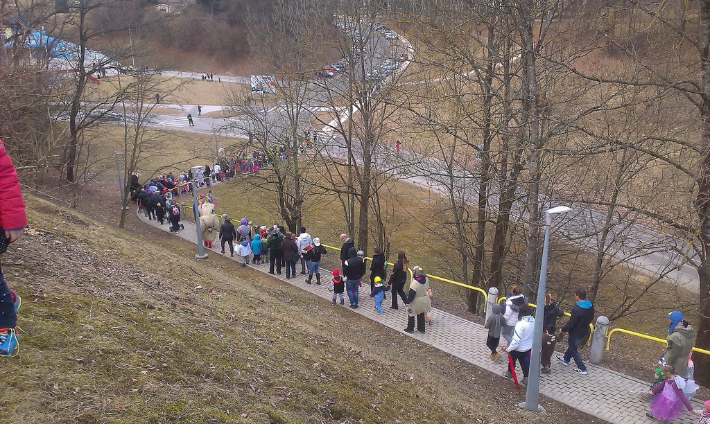 Izvirne otroške maske, ki so preplavile vrtec, so se zbrale na dvorišču enote Solzice in se skupaj z svojimi vzgojiteljicami podale na pustno povorko po bližnji okolici mesta. Ob živahnem prepevanju so pospremili starko Zimo v prešerno razigrani povorki in se vrnili nazaj na dvorišče vrtca, kjer so se zbrali na bližnjem hribčku. Na hribu jih je čakala starka Zima, okoli nje pa se je zbrala raznolika množica maškar - vse od princesk, rdečih kapic, čebelic, gusarjev, policistov, levčkov, pikapolonic, klovnov in drugih izvirnih mask. Ob prepevanju pesmic so se skupaj z njimi veselili pomladi, plesali in odganjali zimo tudi obiskovalci, ki so jim prišli pomagati, da bi s skupnimi močmi v deželo čim prej priklicali pomlad.