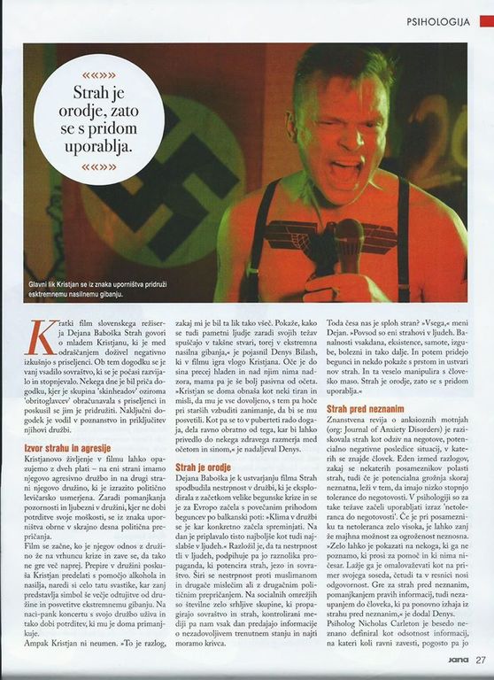Slovenski režiser Dejan Babosek s svojim filmom Strah in precej aktualno zgodbo opozarja na veliko nevarnost in javnost poziva k strpnosti in sprejemanju različnih kultur. Film z močno družbeno angažirano vsebino je namenjen ozaveščanju ljudi, občinstva v dvorani kot celotne javnosti. Zanimiva tematika, ki te šokira, te spravi v jok in se te resnično dotakne. Ob njem se zamisliš.