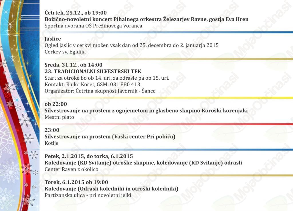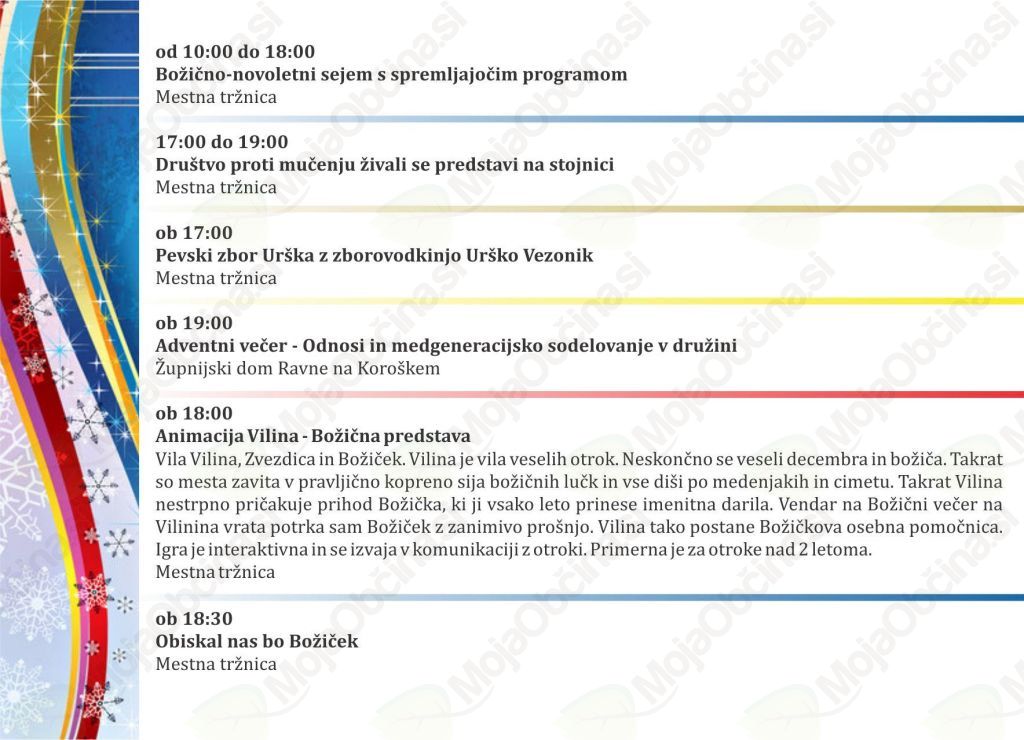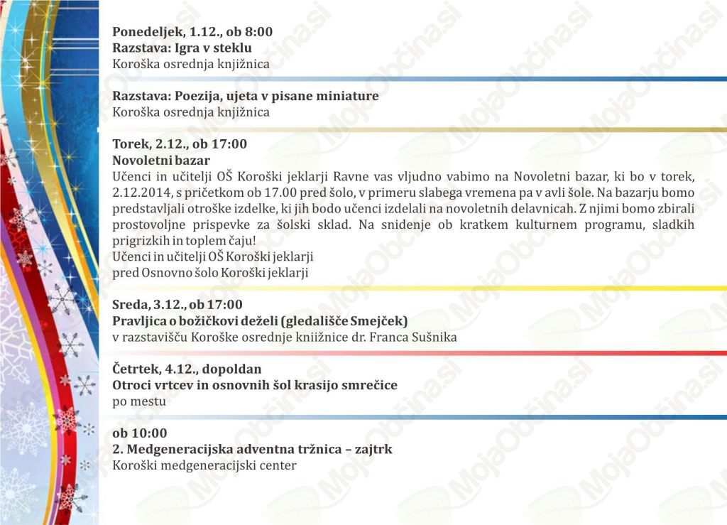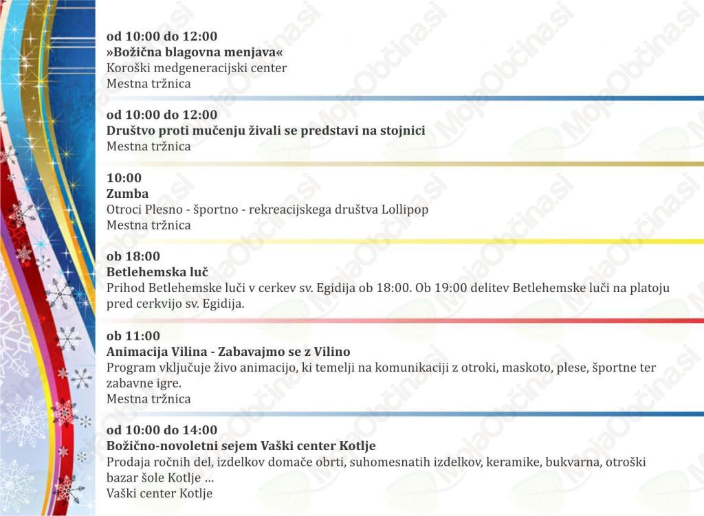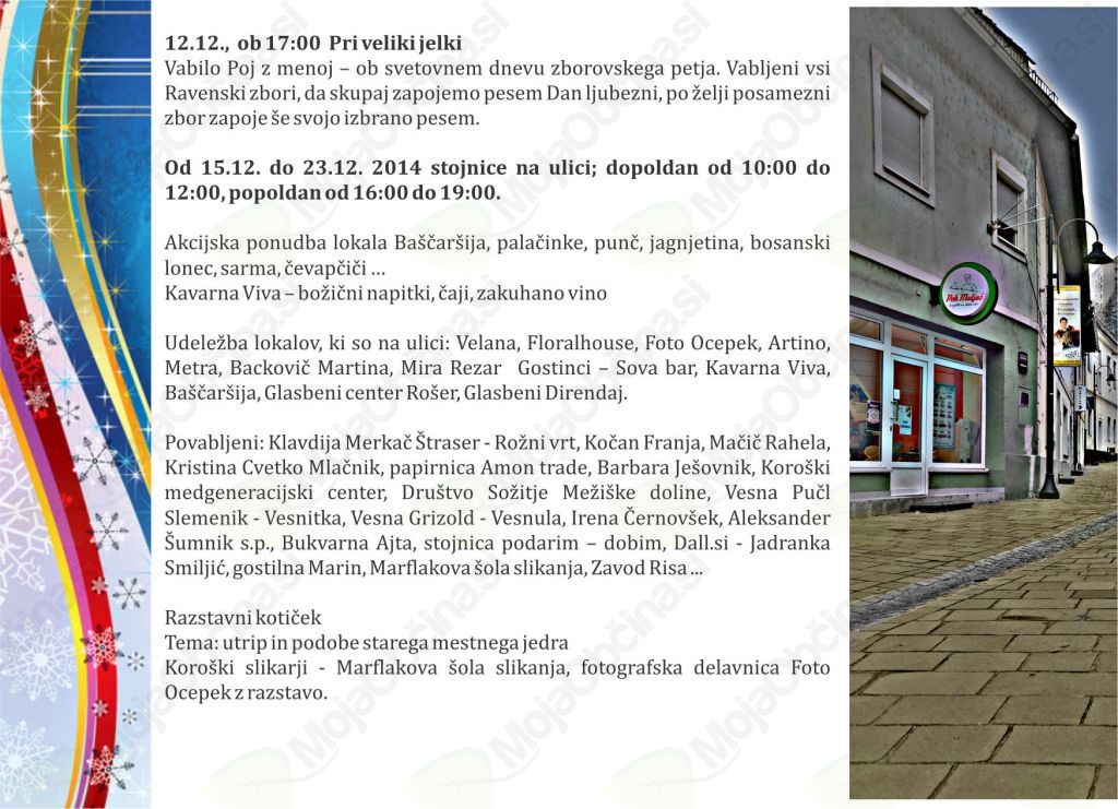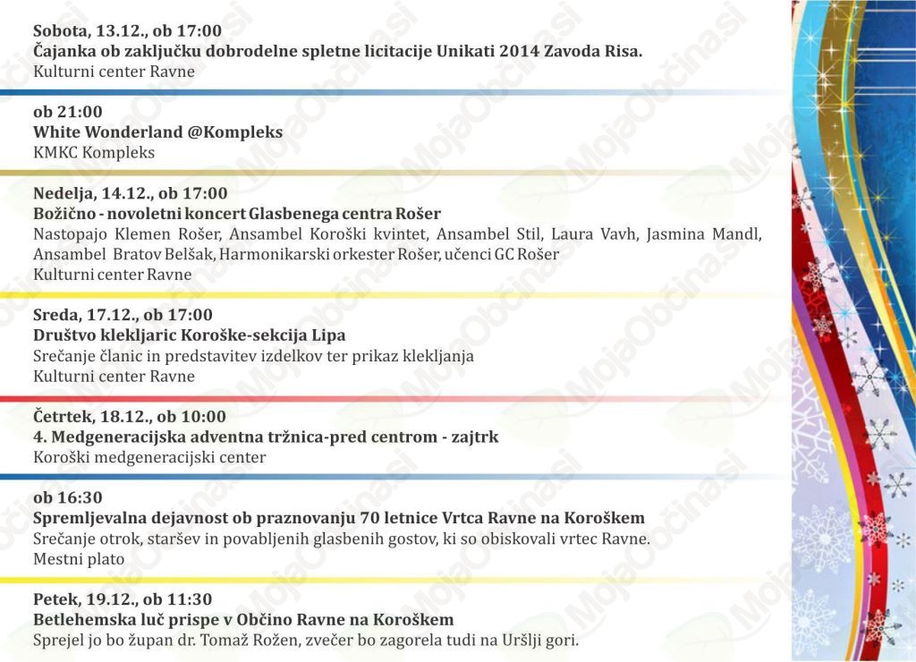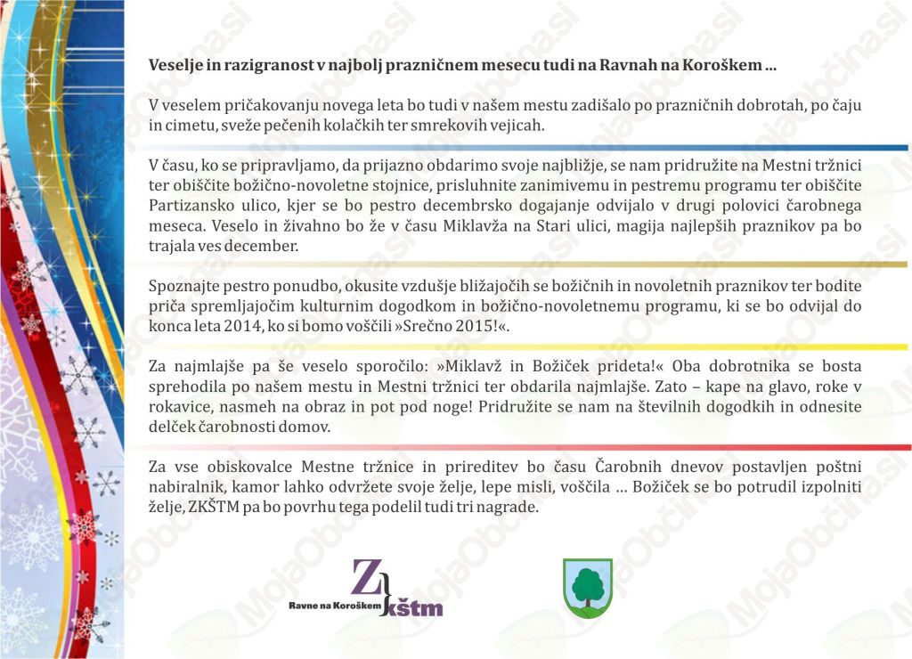 Spoznajte pestro ponudbo, okusite vzdušje bližajočih se božičnih in novoletnih praznikov ter bodite priča spremljajočim kulturnim dogodkom in božično-novoletnemu programu, ki se bo odvijal do konca leta 2014, ko si bomo voščili »Srečno 2015!«.