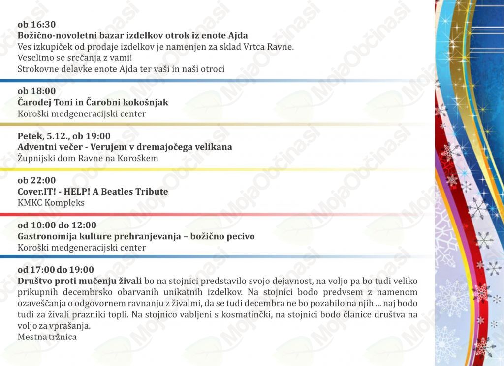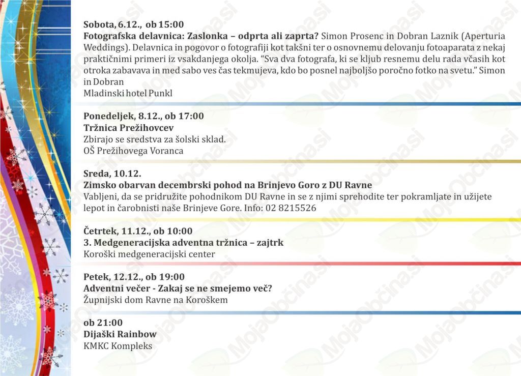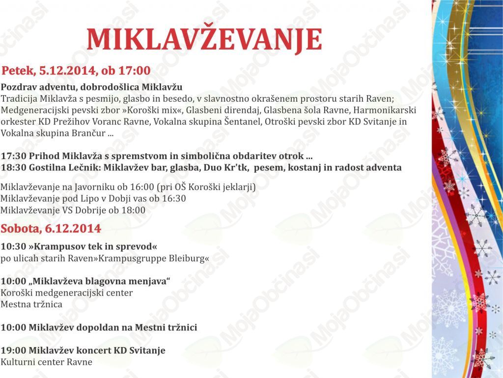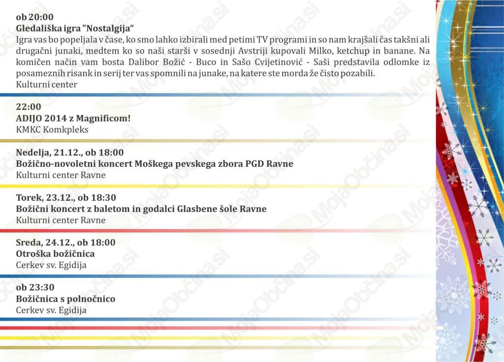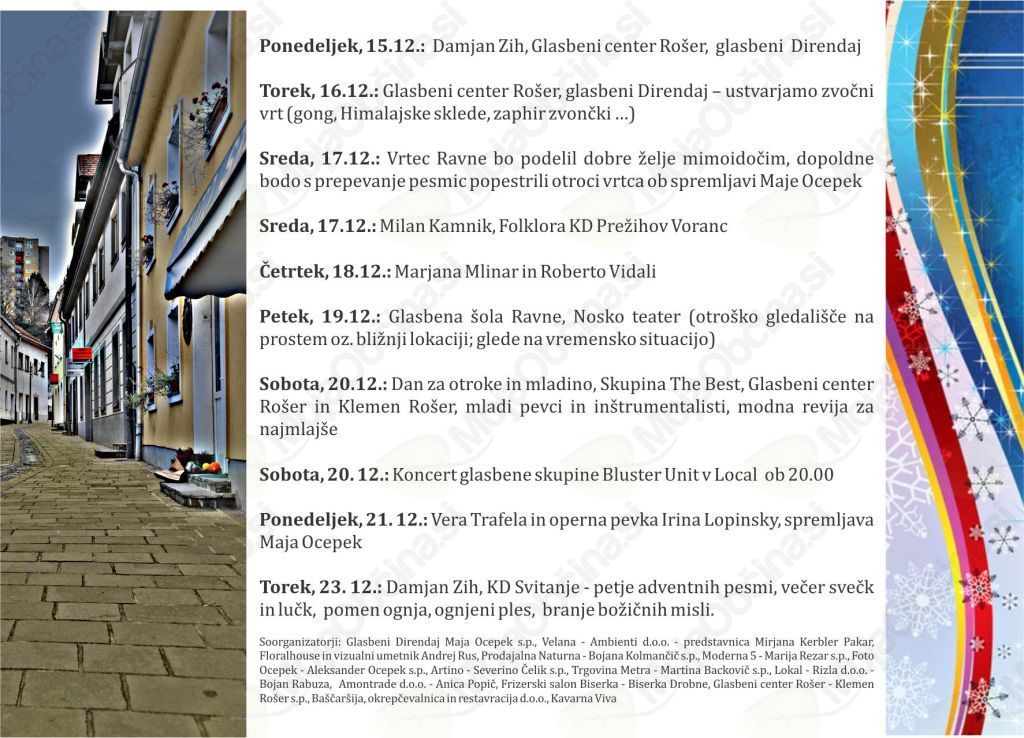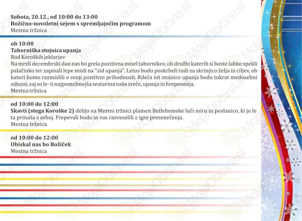 Spoznajte pestro ponudbo, okusite vzdušje bližajočih se božičnih in novoletnih praznikov ter bodite priča spremljajočim kulturnim dogodkom in božično-novoletnemu programu, ki se bo odvijal do konca leta 2014, ko si bomo voščili »Srečno 2015!«.