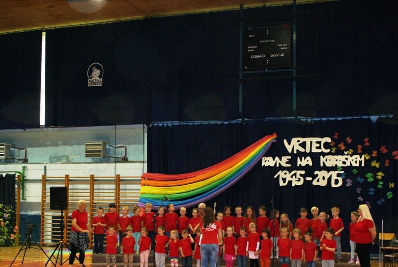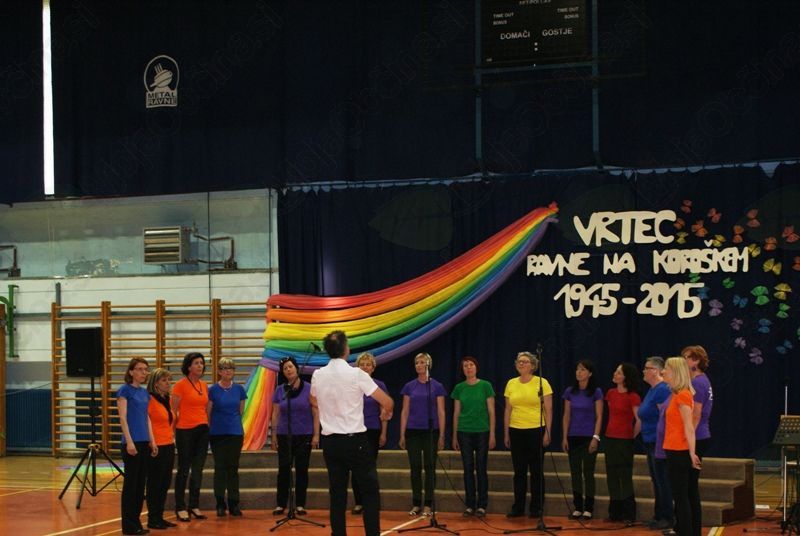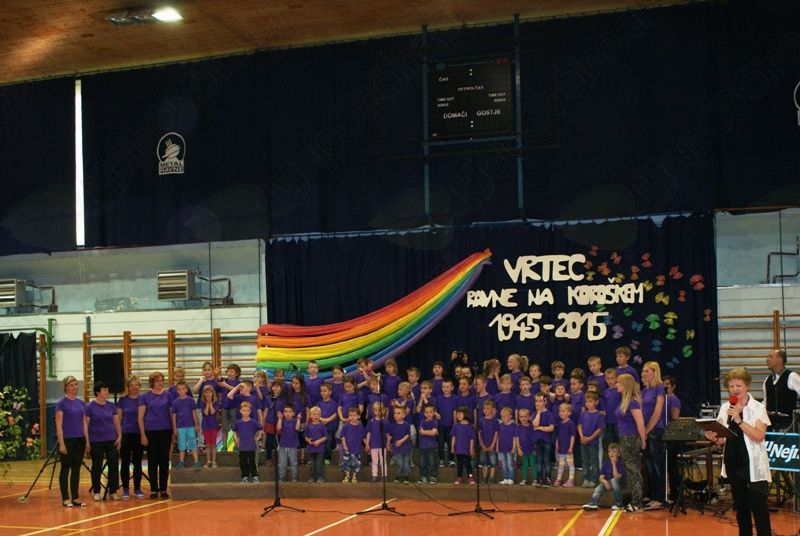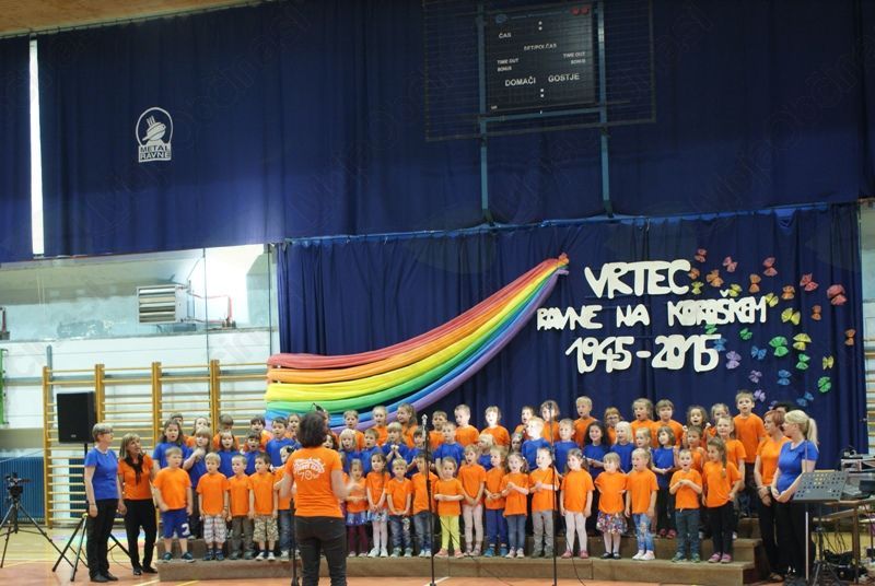 Vse tri enote so z osrednjo slovesnostjo, skozi pesem, recitacijo in ples proslavile častitljiv jubilej. Na odru so se predstavili otroci, pevski zbori, pa luštni mladi plesalci, seveda skupaj s svojimi vzgojiteljicami. Pevski zbor pa imajo tudi strokovne delavke Vrtca Ravne in tokrat smo lahko prisluhnili tudi njim. Zaključek toplega in izredno srčnega večera pa je dosegel vrhunec, ko se je 400 zbranim mladim pevkam in pevcem na odru pridružila še Tanja Žagar, v pesmi pa so jih odlično spremljali člani glasbene skupine Nou Nejm Band.