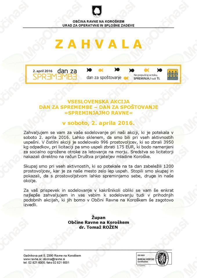 Zahvaljujem se vam za vaše sodelovanje pri naši akciji, ki je potekala v soboto 2. aprila 2016. Lahko sklenem, da smo bili pri vseh aktivnostih uspešni. V čistilni akciji je sodelovalo 996 prostovoljcev, ki so zbrali 3950 kg odpadkov, pri licitaciji pa smo uspeli zbrati 175 EUR, ki bodo namenjeni za socialno ogrožene otroke za letovanje na morju. Sredstva so licitatorji nakazali direktno na račun Društva prijateljev mladine Koroške.