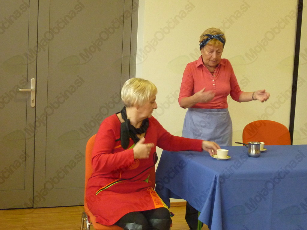 Za uvod v Ženski zajtrk so članice gledališke skupine Koroškega medgeneracijskega centra zaigrale dva skeča.