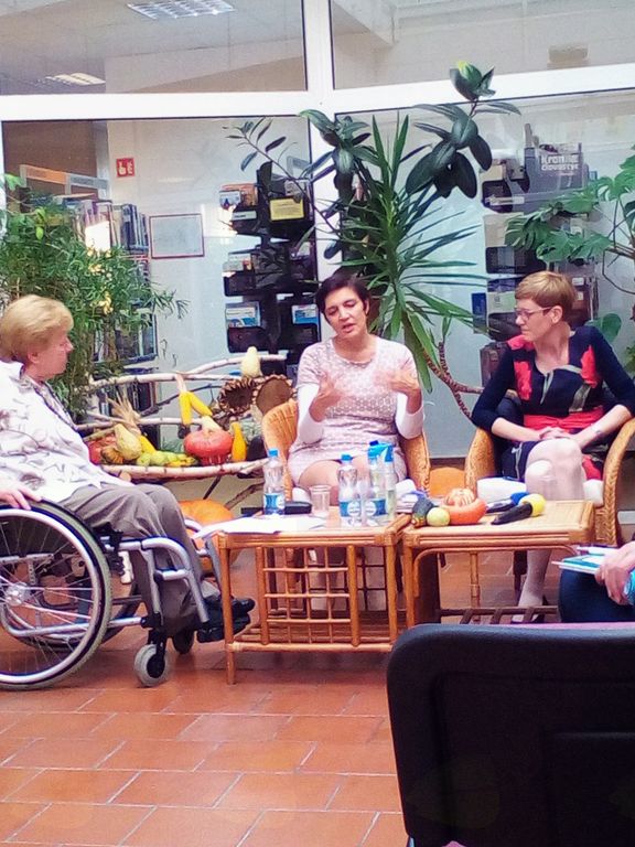 Skozi pet sklopov tem je vodil Stojan Rozman iz Društva paraplegikov Koroške. Po predstavitvi gostij, njihovega dela in poslanstva, smo se dotaknili uresničevanja, izvedbe in razvoja idej, dela skozi društva, sistem. Zanimivo je bilo poslušati kako so premagovale ovire, podale nekaj napotkov kako so se te premagale, se pri tem dotaknile stanja zakonodaje, kako tu kaj posodobiti; predstavile so svoje projekte, dosežke – posebno tiste, ki so spremenili zakonodajo ter tiste, ki to še bodo. V debato se je izredno informativno, spodbudno in konstruktivno vključila tudi namestnica varuhinje človekovih pravic ga. dr. Kornelija Marzel. Gostje so si za naprej zaželele: Ga. Kralj – več razumevanja, spoznanja problema nasilja nad invalidi; zadosti denarne podpore programu, da lahko zaposlijo strokovno pomoč in nudijo ustrezno pomoč vsem potrebnim. Ga. Murgel – da pomaga strokovno in poslansko spremeniti še kakšen predpis ali zakon, ki bi uredil pravice mater otrok s posebnimi potrebami in seveda otok samih. Ga. Gerenčer Pegan – pa, da se prizna pravica do jezika za gluhoslepe, da informacije pridejo do starše otrok z gluhoslepoto ter, da se prepozna starostna gluhoslepota in nenazadnje, da napiše še kakšno knjigo. Aplavz, poklon tem ženskam, tem humanitarkam in, da dobijo v bojih, ki jih bijejo čimveč pomoči in posluha.