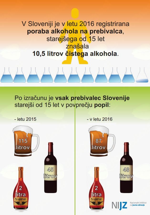 Registrirana poraba alkohola v Sloveniji se je v letu 2016 znižala v primerjavi z letom poprej. Nacionalni inštitut za javno zdravje (NIJZ) svetuje: poskrbite, da boste v poletnih mesecih zaužili dovolj tekočine. Najbolj odžeja voda, alkoholu se izogibajte, saj povečuje dehidracijo, uvrščen pa je tudi v skupino rakotvornih snovi.
