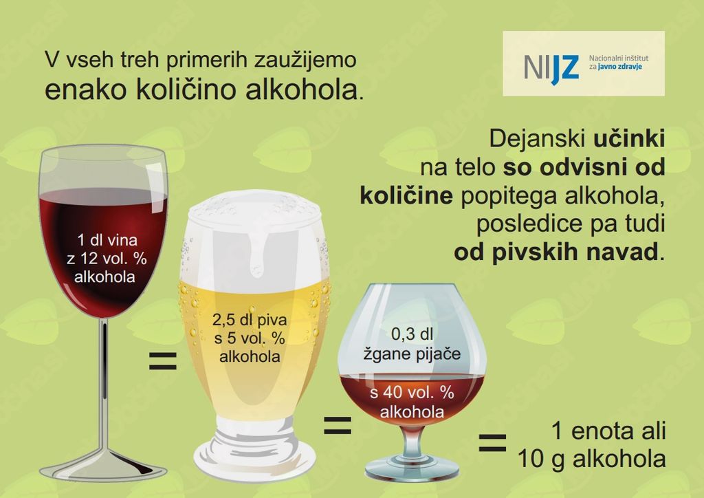 »Opažamo, da pogosto še vedno zmotno mislimo, da sta pivo in vino manj škodljivi pijači v primerjavi z žganjem, kar ne drži. Ne poznamo manj ali bolj škodljivih alkoholnih pijač, saj vse vsebujejo glavno sestavino alkoholnih pijač, to je etanol. Res je sicer, da pivo vsebuje v povprečju manj volumskega odstotka alkohola v primerjavi z vinom, pivo in vino pa manj volumskega odstotka alkohola v primerjavi z žganimi pijačami, vendar je vsebnost alkohola v alkoholni pijači približno enaka v primerih, ko popijemo kozarec (1 dcl) vina z 12 vol. % alkohola ali vrček (2,5 dcl) piva s 5 vol. % alkohola ali kozarček (0,3 dcl) žgane pijače s 40 vol. % alkohola. Dejanski učinki na telo so odvisni od količine popitega alkohola, predvsem gramov čistega alkohola, posledice pa tudi od pivskih navad,« je opozorila prim. as. dr. Barbara Lovrečič z NIJZ.