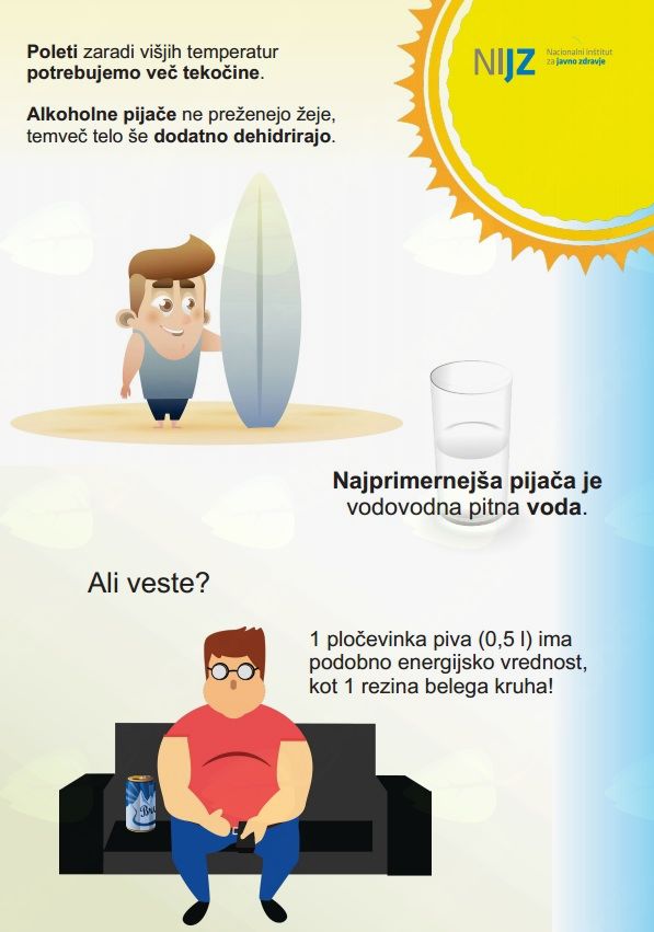 »Ob tem je vredno dodati, da alkoholne pijače predstavljajo tudi nezanemarljiv energijski vnos – 1 pločevinka piva (0,5 l) ima podobno energijsko vrednost kot 1 rezina belega kruha,« je povedala dr. Urška Blaznik, univ. dipl. kem., spec. san. kem. z NIJZ in dodala: »V poletnih mesecih zaradi višjih temperatur naše telo potrebuje več tekočine. Pogosto je prepričanje, da nekatere alkoholne pijače preženejo žejo. Prav nasprotno, alkoholne pijače telo še dodatno dehidrirajo. To najbolje zaznamo z občutkom za žejo in s pogostostjo odvajanja vode. Že blaga izsušitev ali dehidracija, to je zmanjšanje količine telesnih tekočin za en do dva odstotka, lahko bistveno zmanjša naše telesne in duševne sposobnosti. Najprimernejša pijača za odžejanje in nadomeščanje izgubljene tekočine je vodovodna pitna voda, priporočamo pa tudi blage nesladkane čaje. Izotonične pijače so za nadomeščanje tekočine primerne za uživanje le ob vzdržljivostnih telesnih naporih, ki trajajo več kot eno uro. Brezalkoholne sladke pijače pa so zaradi dodanega sladkorja ali sladil ter barvil in arom za odžejanje manj primerne.«