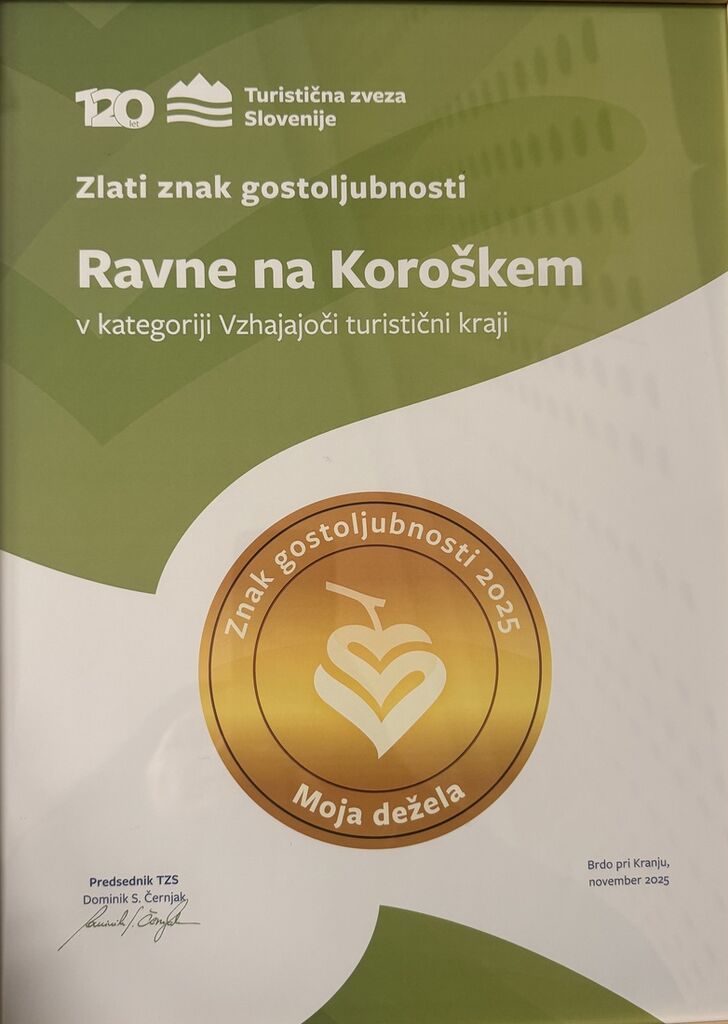 Občina Ravne na Koroškem je prejela zlato priznanje v okviru nacionalne akcije »Moja dežela – znak gostoljubnosti 2025«, ki jo organizira Turistična zveza Slovenije (TZS). Ravne so si prestižno priznanje prislužile v kategoriji vzhajajoči turistični kraji, kar potrjuje uspešen razvoj destinacije, urejenost kraja ter prijaznost do obiskovalcev.