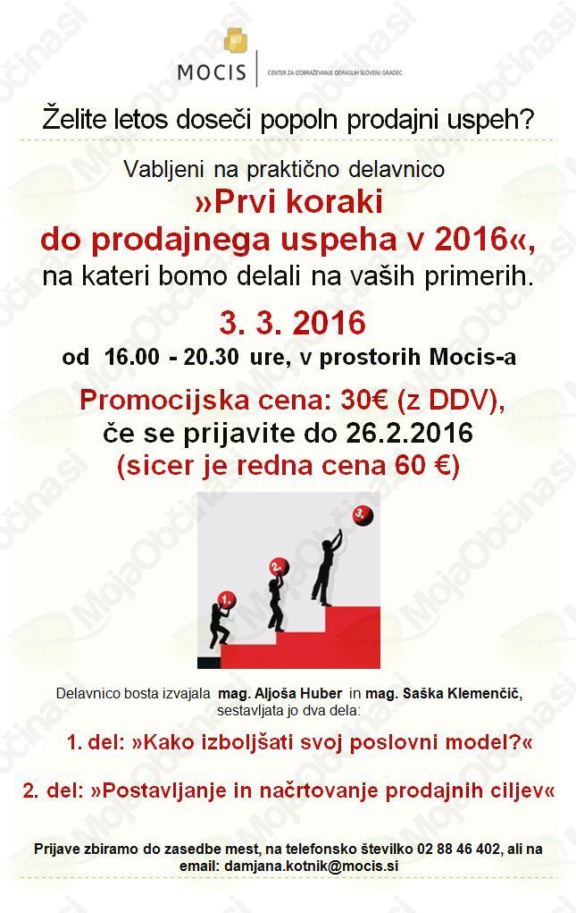 Vabljeni na praktično delavnico »Prvi koraki do prodajnega uspeha v 2016«, na kateri bomo delali na vaših primerih. Delavnica bo potekala 3. 3. 2016 od 16.00 - 20.30 ure, v prostorih Mocis-a